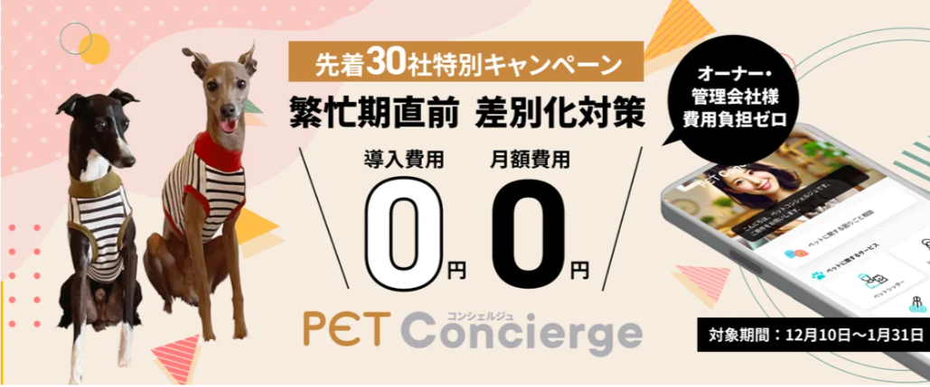 こんにちは。アセットコミュニケーションズ X Concierge事業部による入居者付帯サービス第二弾! 獣医師・建築家・ペット賃貸管理の“最強専門家”チームが集結し、開発したペット可物件向け入居者サービス「Pet Concierge(ペット コンシェルジュ)」の先行キャンペーン(先着30社様)のご案内です。